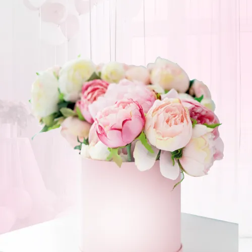 • Стандарт - эустома - 5 шт., роза - 5 шт., роза кустовая - 2 шт., шляпная коробка, оазис
