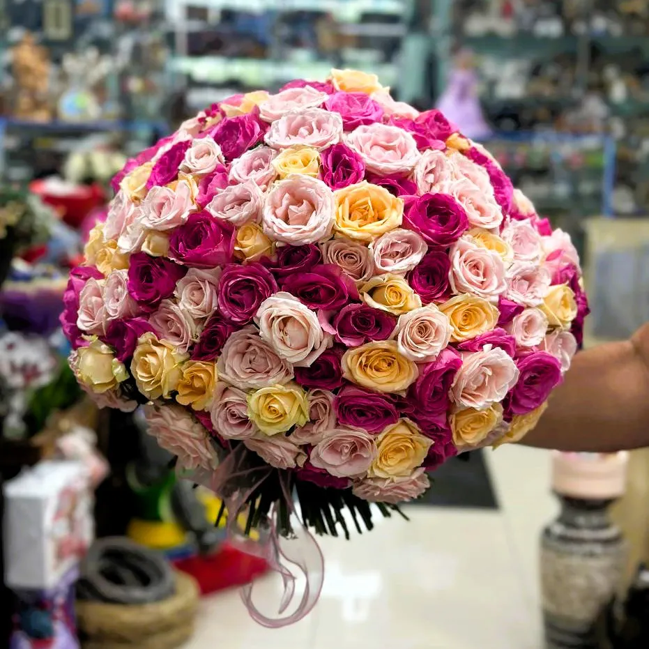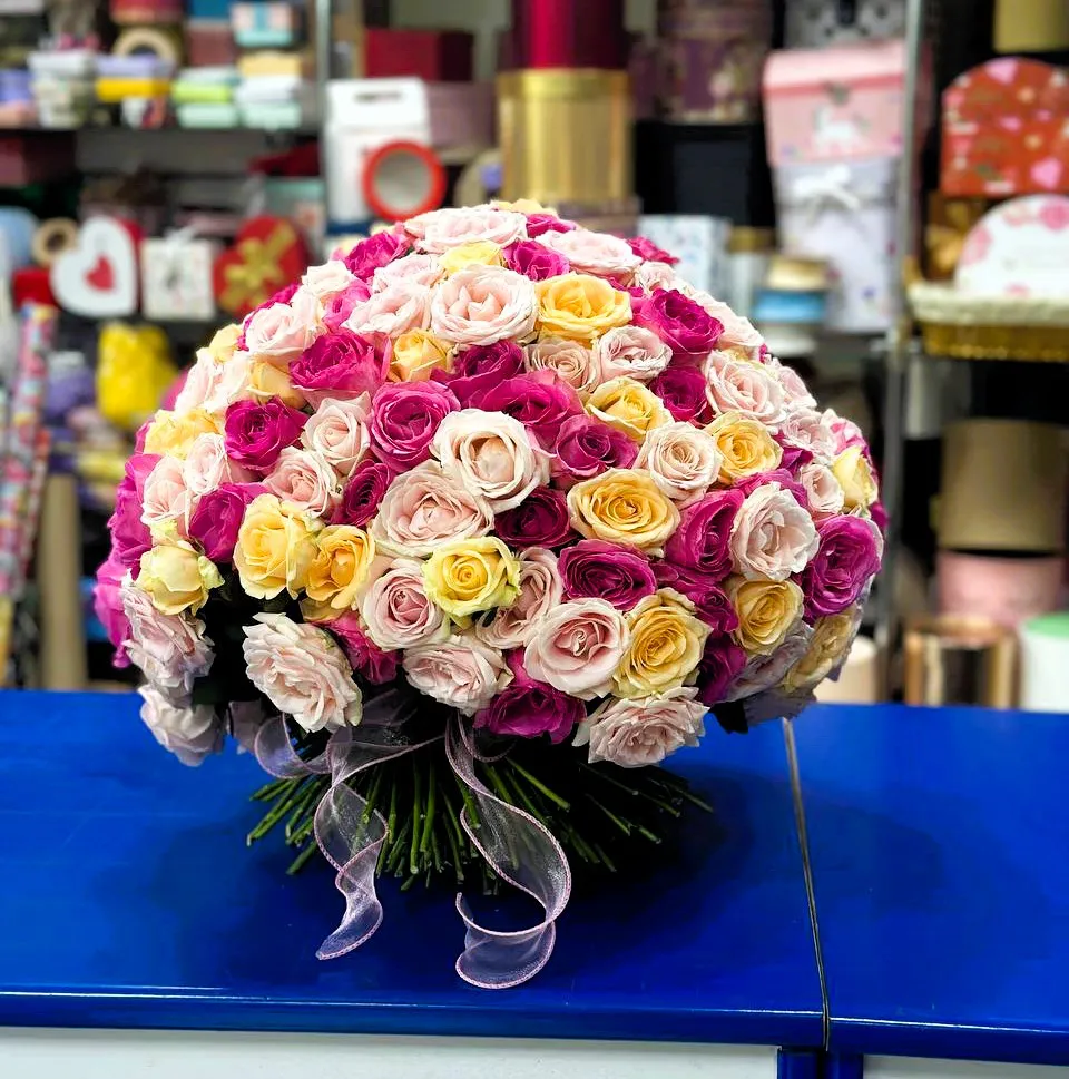 Не упустите шанс подарить своим родным и любимым этот удивительный  билет в мир волшебства и красоты! Букет из 101 розы станет не только ярким акцентом вашего праздника, но и замечательным дополнением к любому интерьеру. Сочетание разнообразных оттенков сделает атмосферу еще более романтичной и уютной.