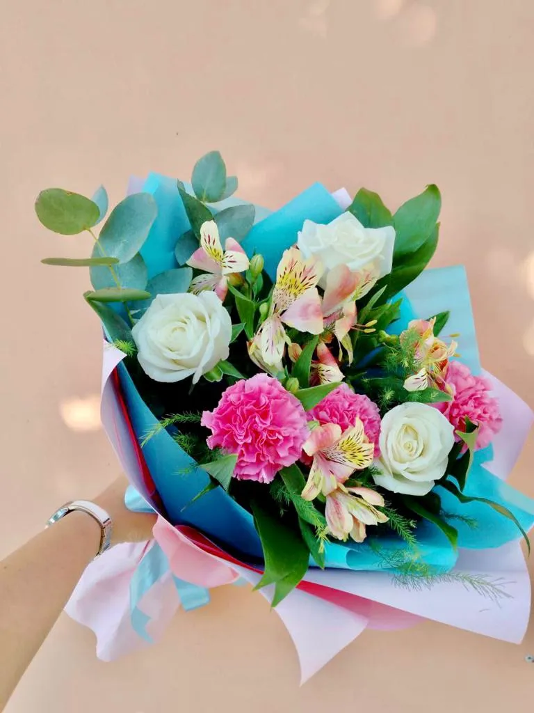 Вариант—Стандарт - роза - 3 шт., гвоздика - 2 шт., альстромерия - 2 шт., эустома - 2 шт., зелень, упаковка, лента