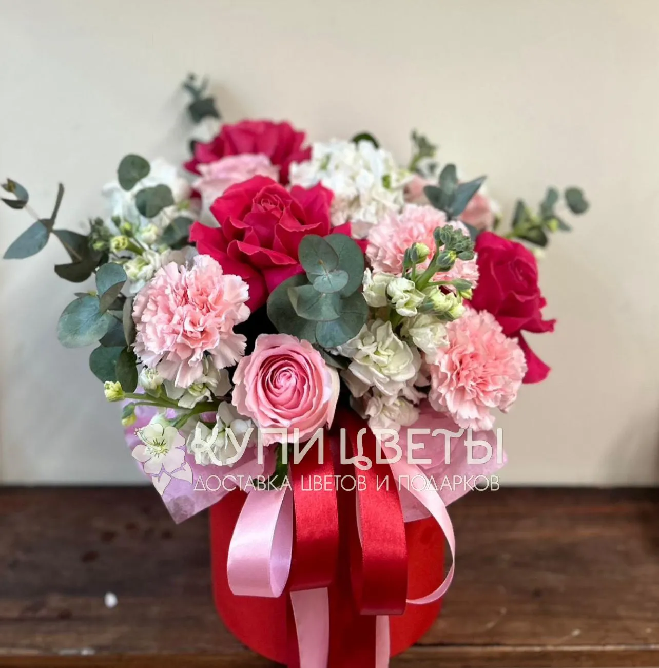 Французкая роза, роза, гвоздика, эвкалипт, шляпная коробка, лента |