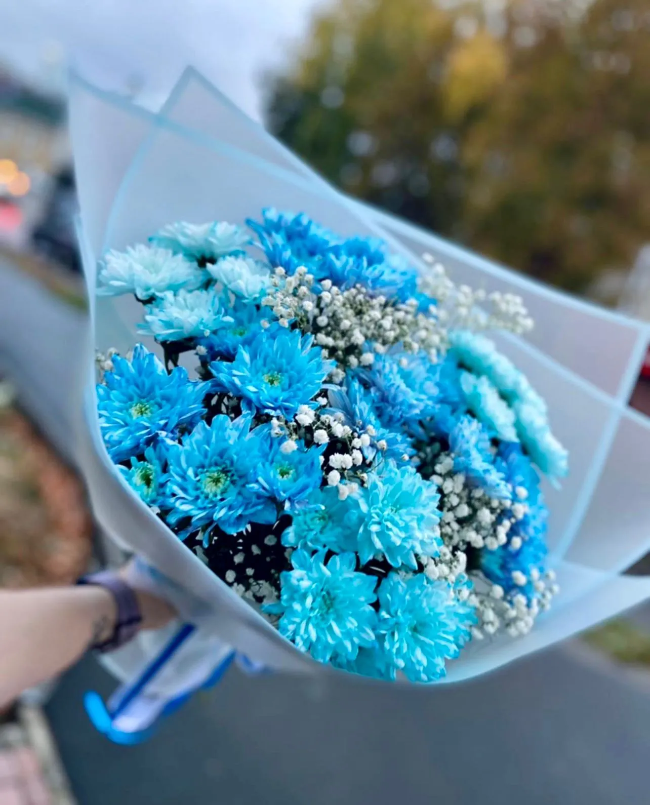 Все это чудо бережно окутано голубой матовой упаковкой, цвет которой напоминает самое глубокое небо на закате или нежные воды кристально чистого озера. Матовая текстура придает упаковке элегантность и изысканность, не отвлекая от красоты цветов. Завершающий штрих – шикарная синяя лента, чья глубина цвета идеально гармонирует с хризантемами, подчеркивая их роскошь и создавая ощущение целостности и гармонии.