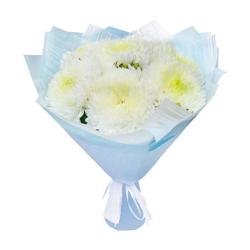 Состав букета: белые одноголовые хризантемы, упаковка, лента