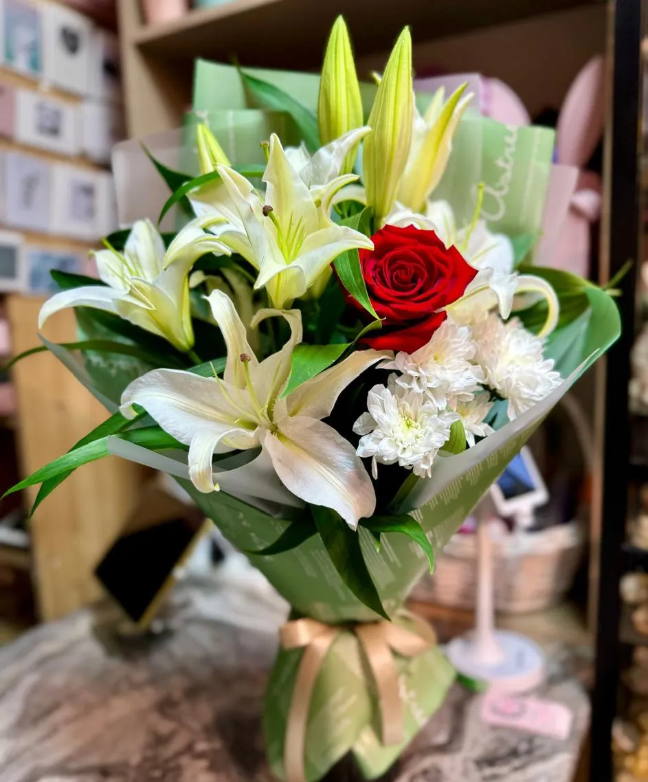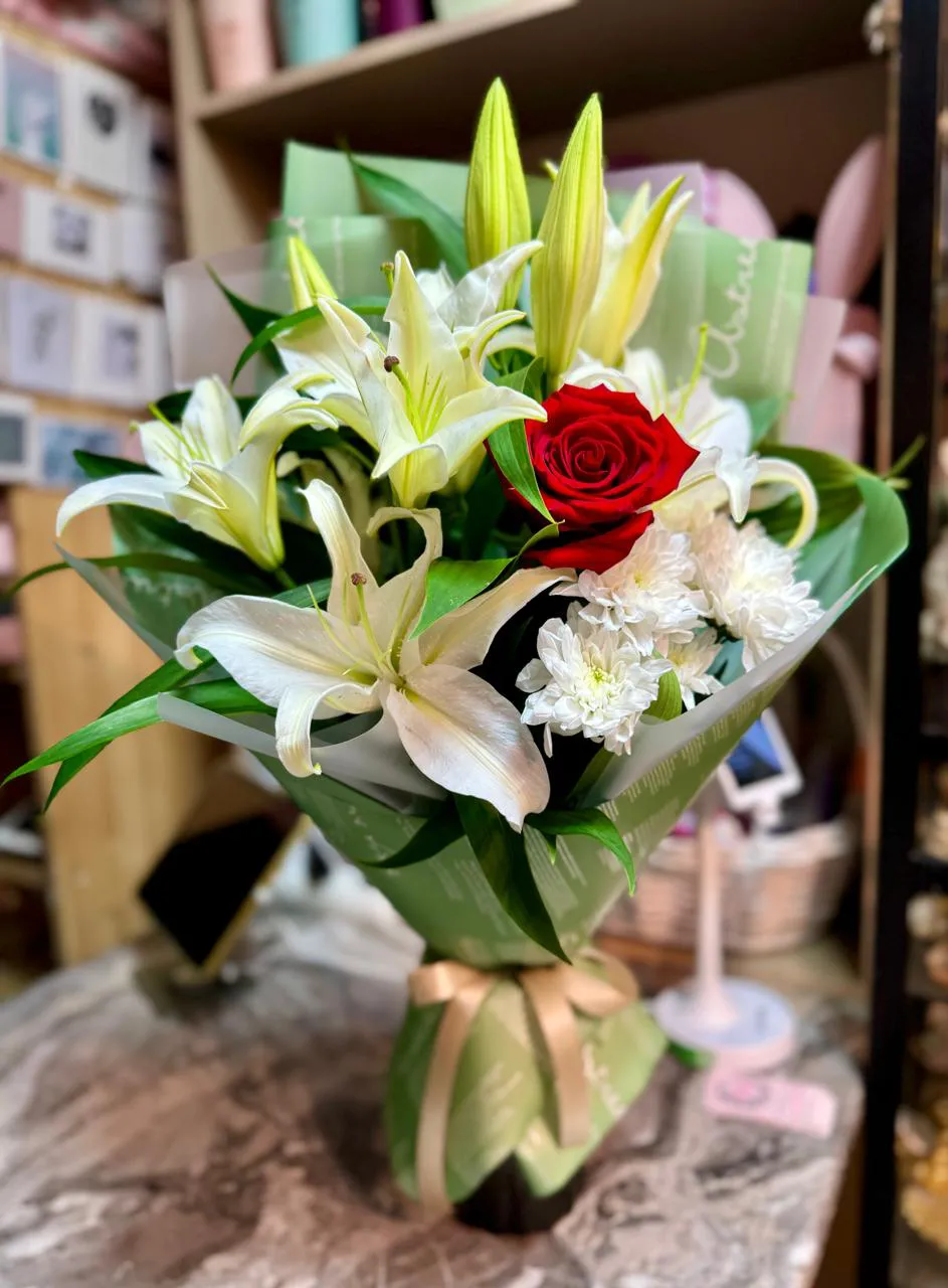 Около розы грациозно располагаются лилии, величественные и элегантные, с их нежным ароматом, способным окутать атмосферу чувственностью и романтикой. Белые хризантемы, словно белоснежные облака, добавляют лёгкости и свежести, дополняя композицию яркими акцентами.