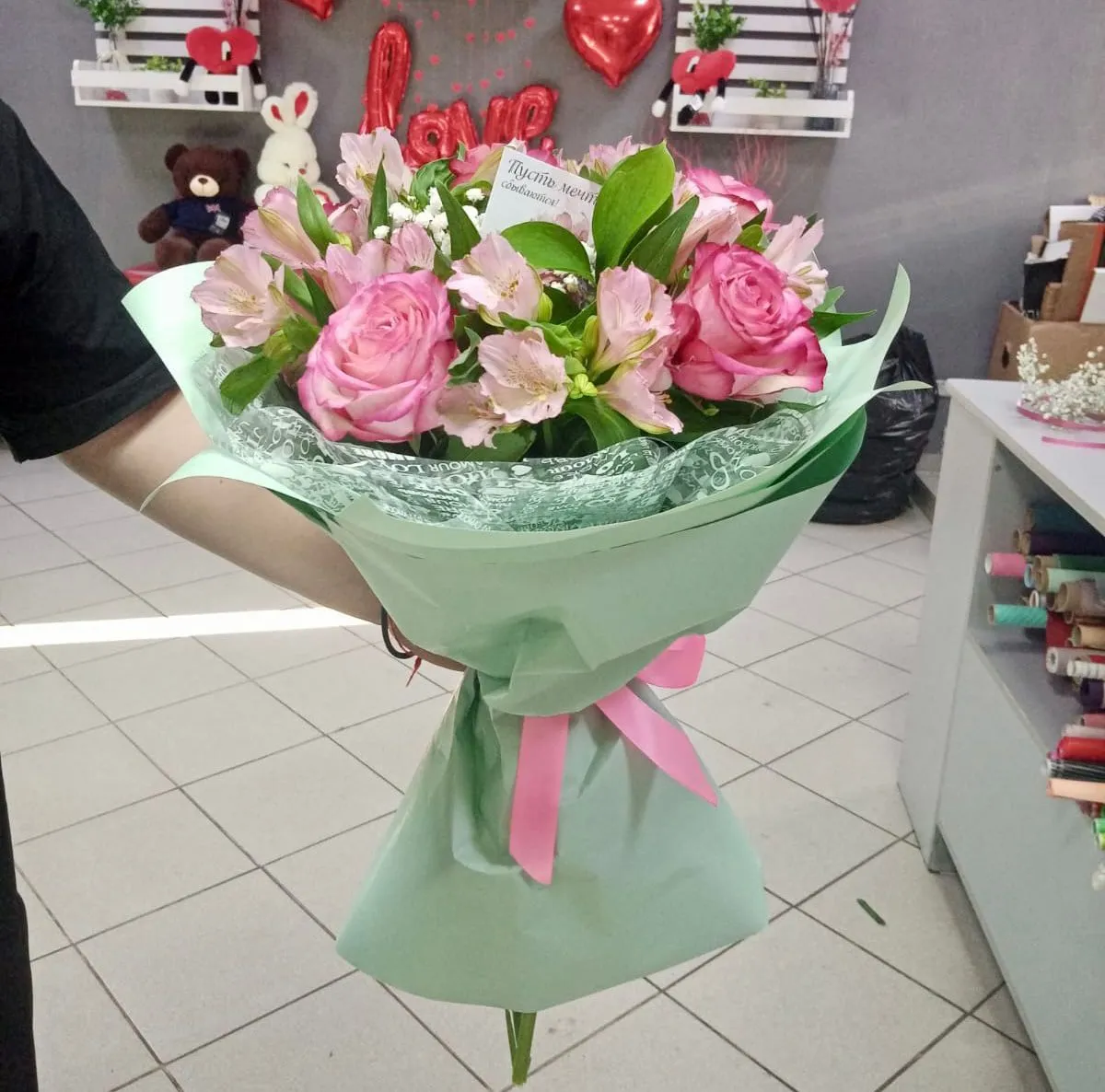 Розы,альстромерии,зелень,упаковка,лента