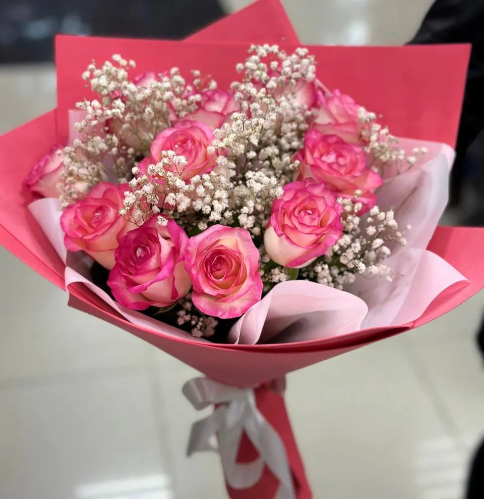 • Средний - роза - 9 шт., гипсофила, упаковка, лента