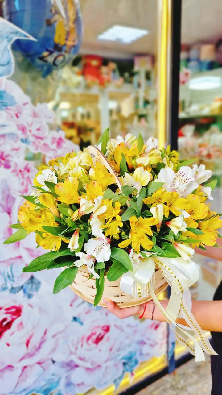 • Премиум - альстромерия - 31 шт., декоративная зелень, оазис, корзина