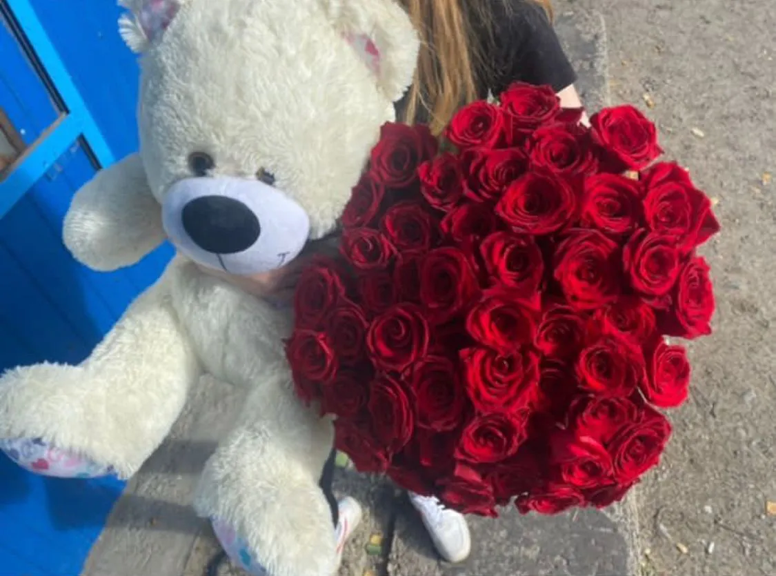 51 красная роза + мягкая игрушка 45 см