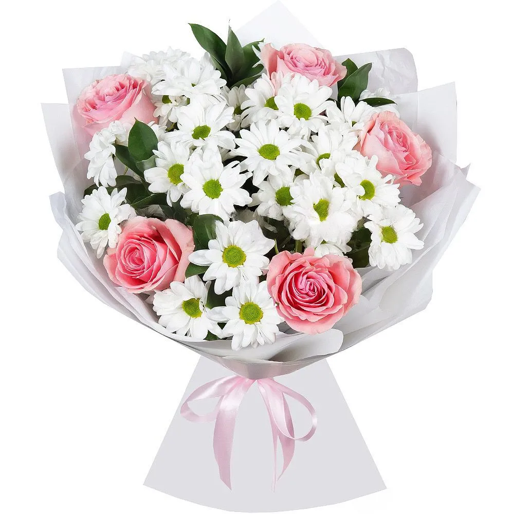 • Стандарт (Кустовая хризантема 4 шт,, роза 5шт, зелень, упаковка, лента)