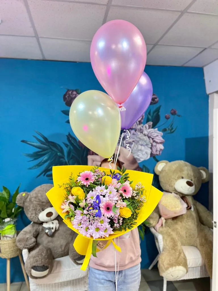 • Стандарт (роза - 3 шт., гербера - 2 шт., альстромерия - 2 шт., кустовая хризантема - 2 шт., ирис - 2 шт., зелень, упаковка, лента)