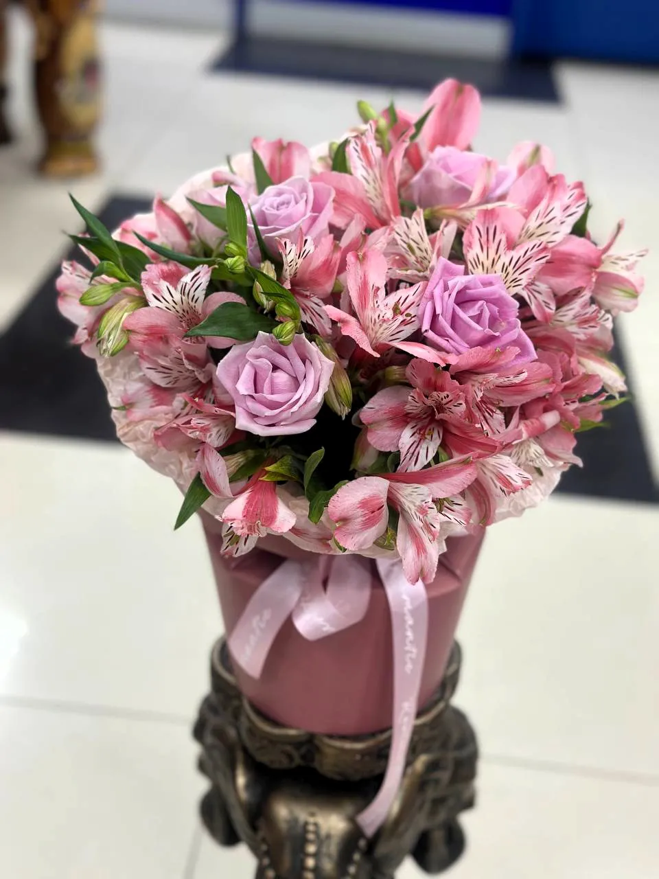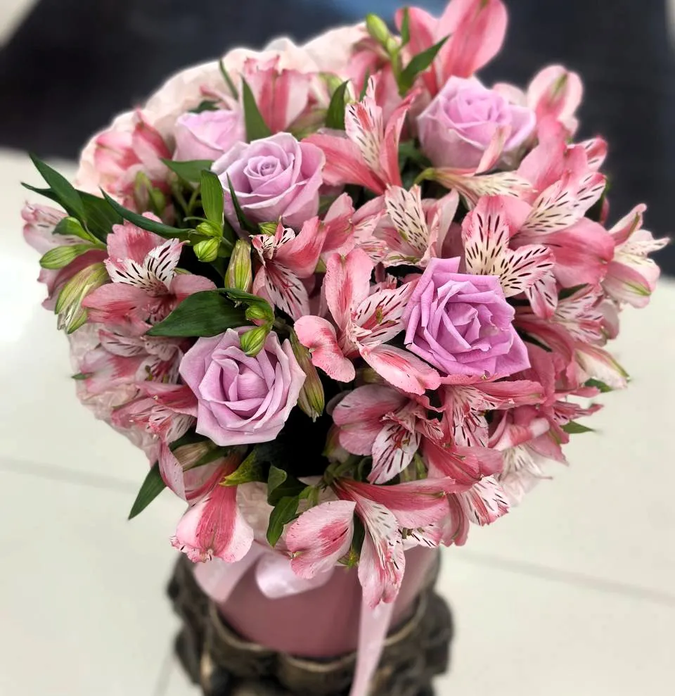 Окунитесь в нежную сказку с этой очаровательной шляпной коробкой, наполненной изысканными розами** и воздушными альстромериями в восхитительных розовых тонах.  Идеальный подарок, чтобы выразить свои самые искренние чувства.  Эта композиция – это воплощение нежности, красоты и элегантности, созданное для самых особенных моментов.  Подарите **розовые розы** и **альстромерии** в стильной шляпной коробке, чтобы напомнить о своей любви и восхищении.