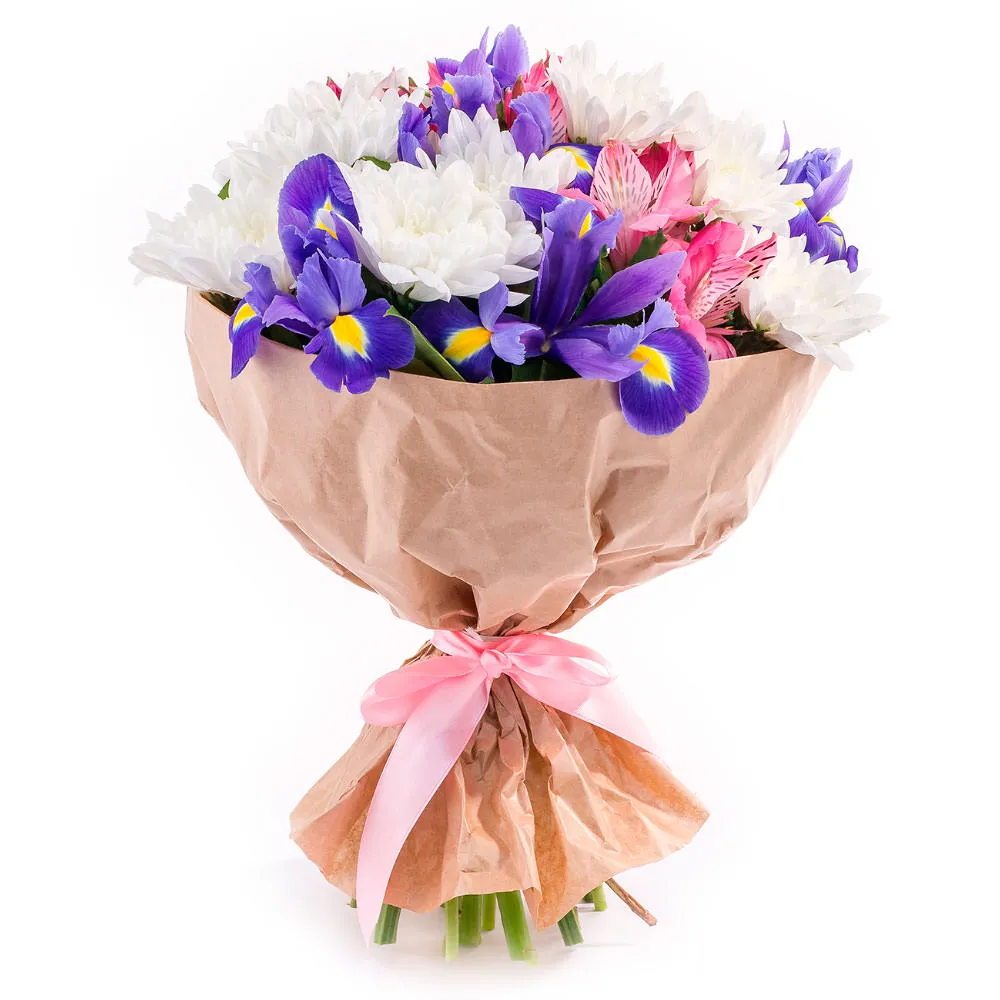 • Стандарт (хризантема - 5 шт., альстромерия - 2 шт., ирис - 2 шт., упаковка, лента)